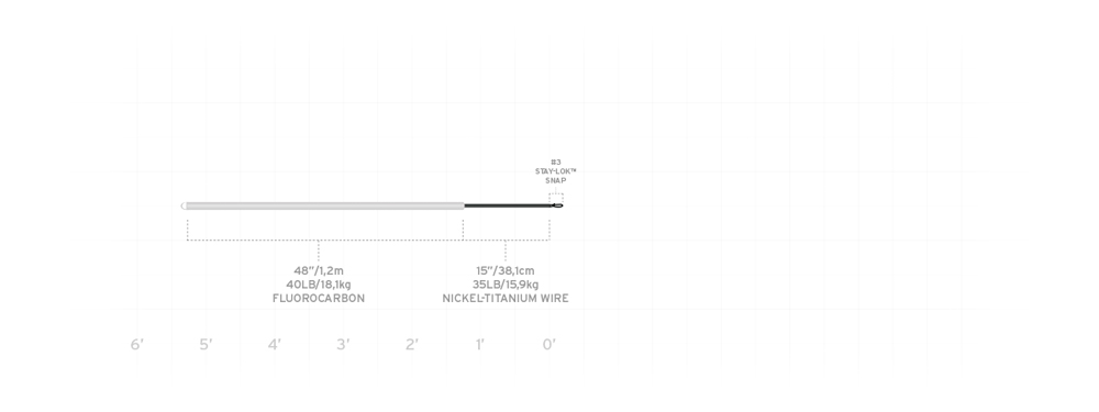 Specs: 48” 40LB fluorocarbon 15” 35LB single-strand titanium Size 3 Stay-Lok Snap